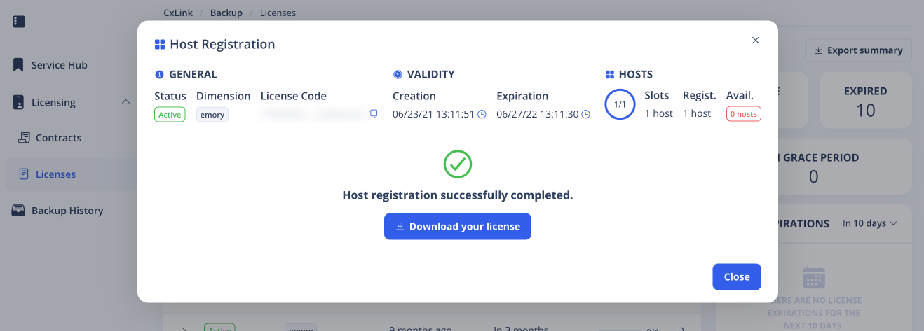 ? CxLink Backup: License ? Select action to perfom: Register license License Console User name: cxlink.user@syntax.com License Console Password: ******** ? Organization: [Use arrows to move, enter to select, type to filter, ? for more help] Dummy_org_01 > Dummy_org_02If the registration is successfull, a message will be displayed: