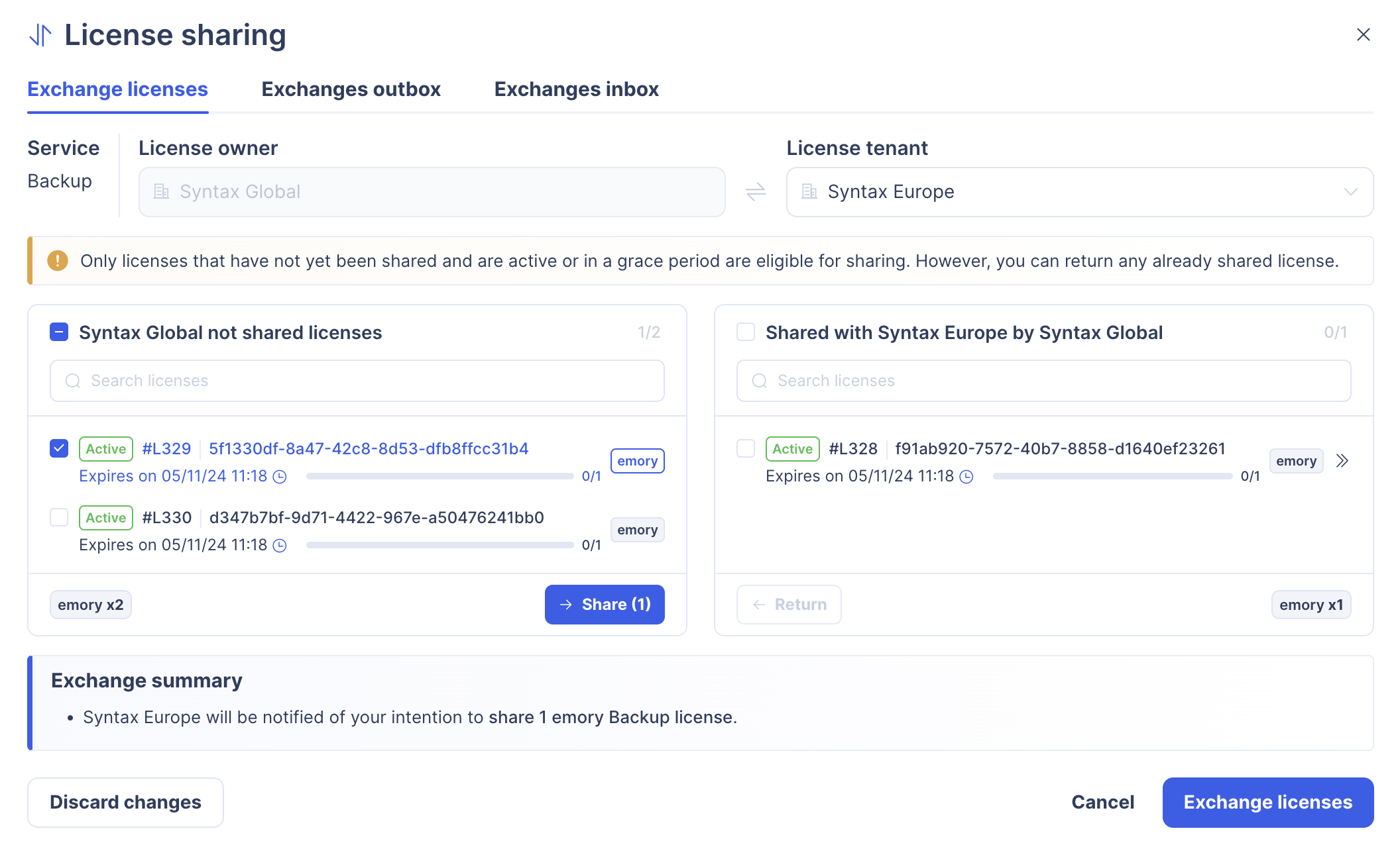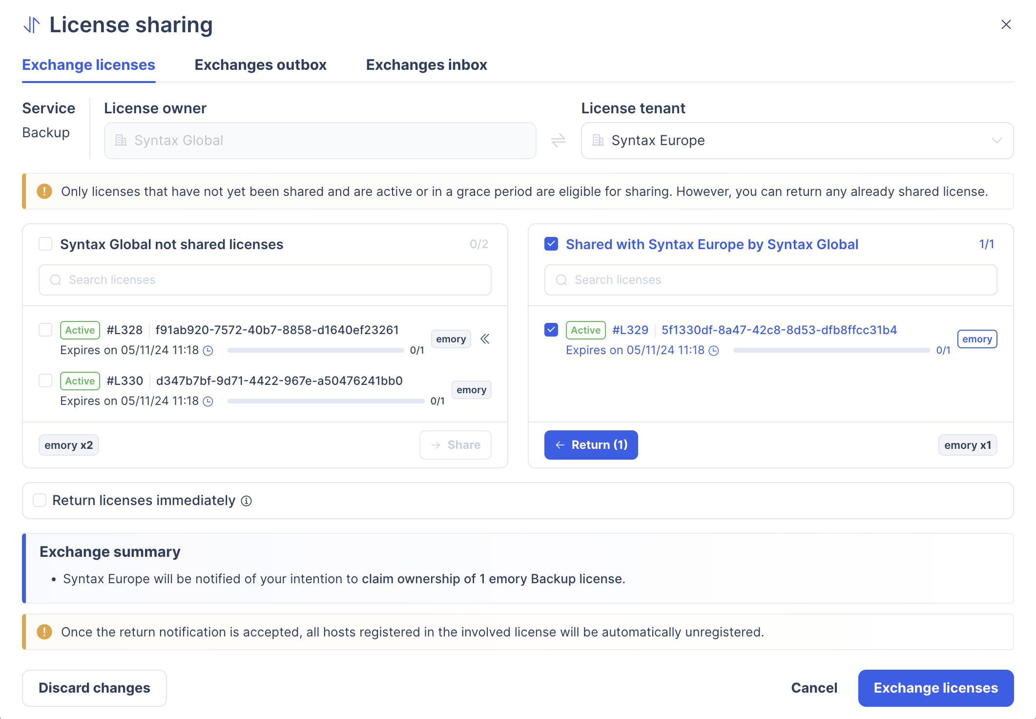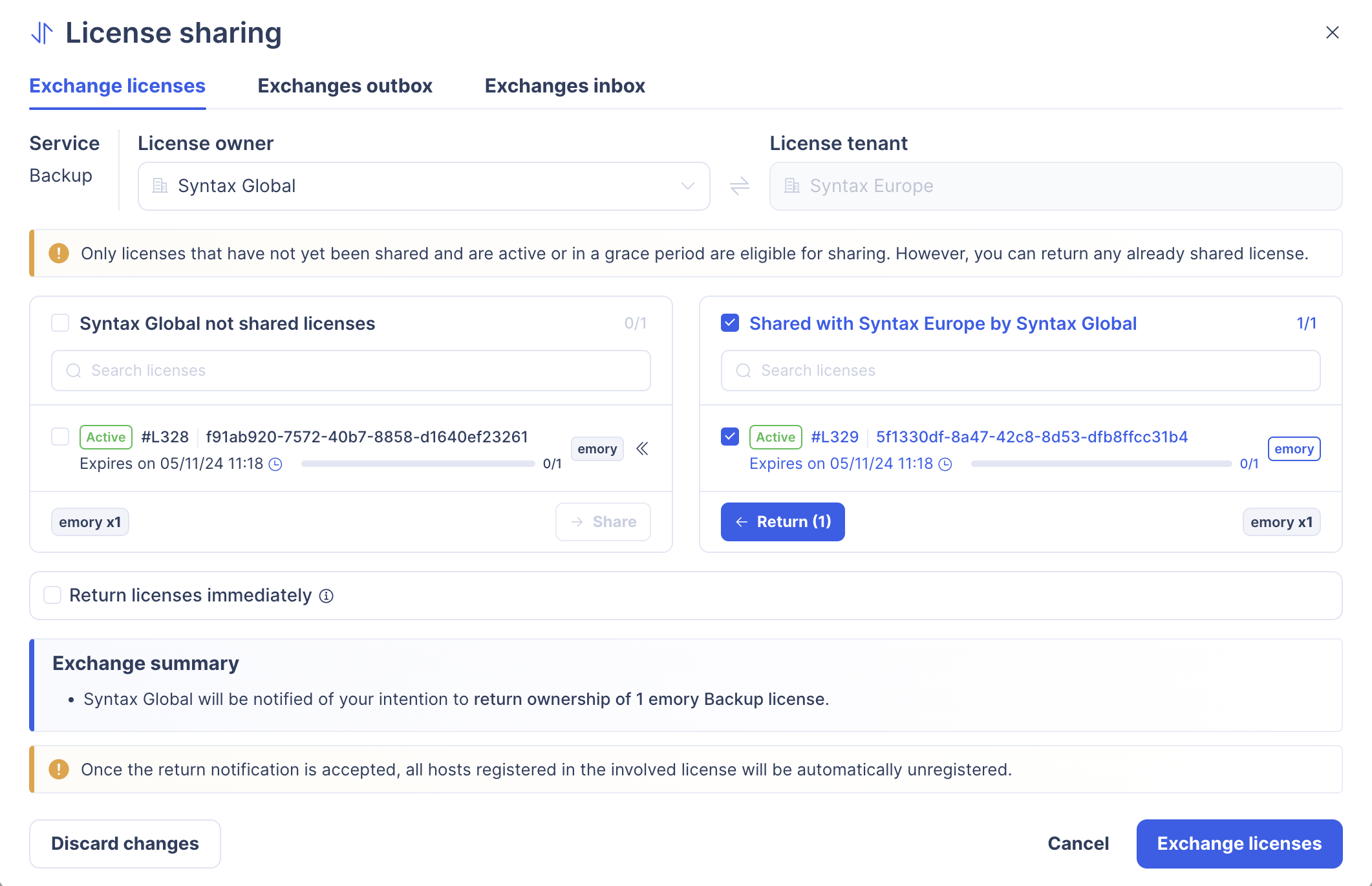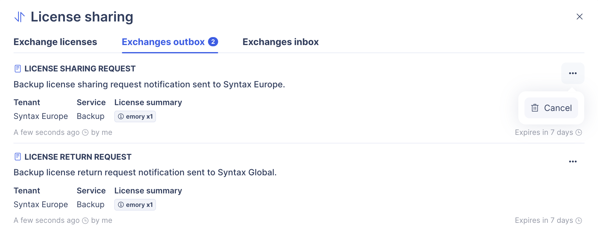 This newly created return request notification will be also listed in the "Exchanges outbox" tab (if "Return licenses immediately" option was not checked), and you will be able to cancel the notification from there. More information in the Cancelling a sharing notification section.