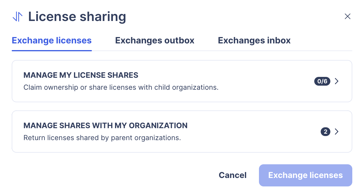 "Manage my license shares": Claim ownership or share licenses with child organizations.