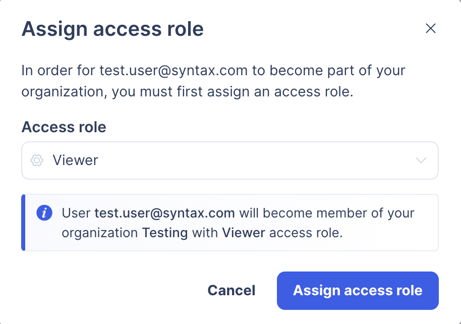 Once you've selected an access role, the new member will be included in your organization with the permissions granted by the selected role.