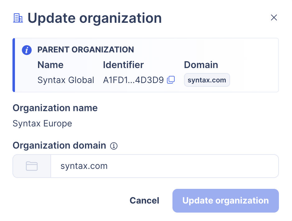 The "Update organization" dialog will appear, fill in the form and hit the "Update organization" button to modify the organization information.
