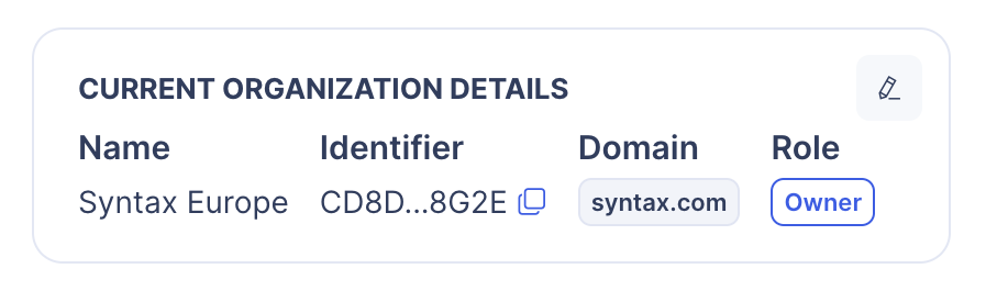 From the "Current organization details" card, using the button located in the upper right corner of the card.