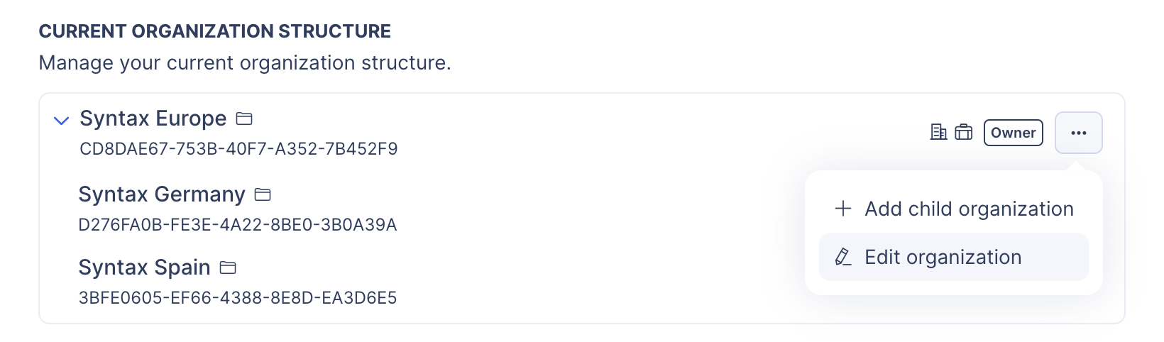 Open the contextual menu by clicking on the button located at the end of your current organization, and hit the "Add child organization" option.