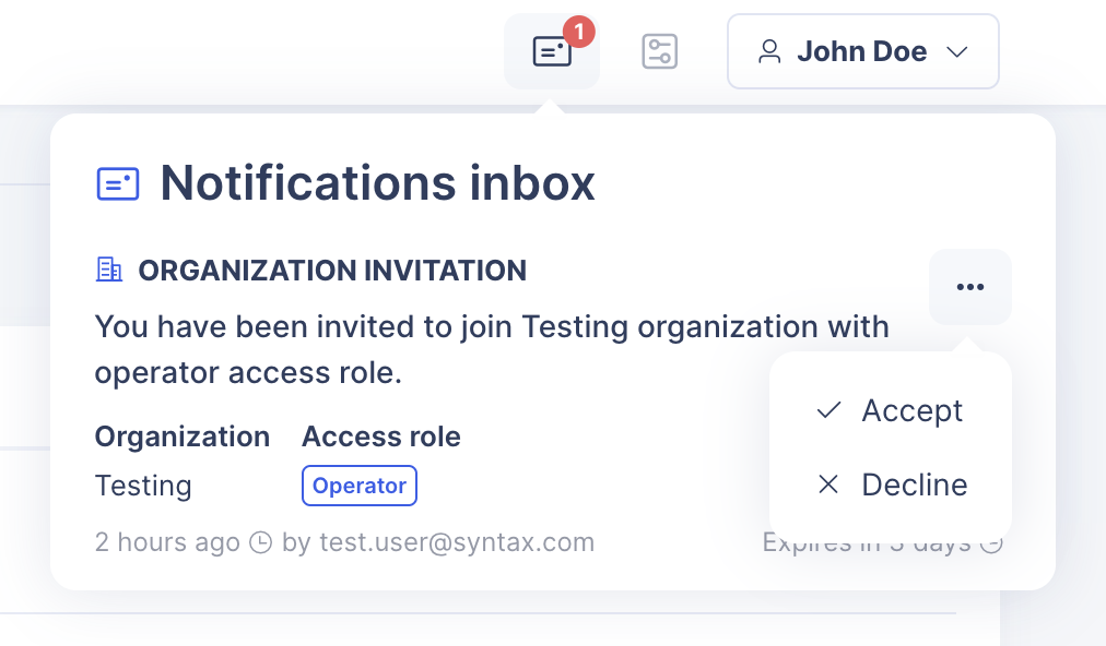 If your invitation was not consumed, either because you did not access through the link received by email or because you postponed the invitation, when you sign in with an account with the same email that the invitation was sent to, you will find the invitation notification in your notifications inbox, and you will be able to accept or decline it.