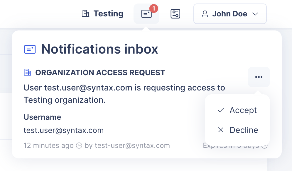 When a user is requesting access to your organization, a new organization access request notification will appear in your notifications inbox. When accepted, you will be prompted to assign a new access role to the new member.