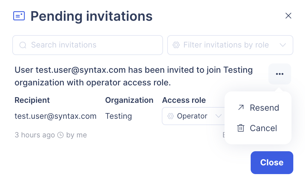 A new dialog will appear with all pending invitations for the organization. You can cancel or resend the invitation, as well as modify the assigned access role.